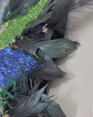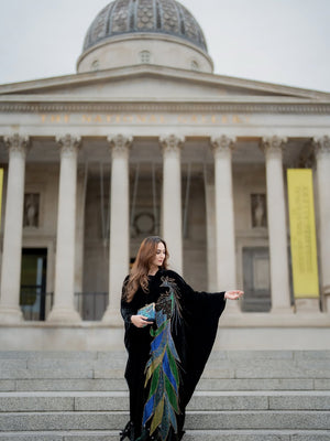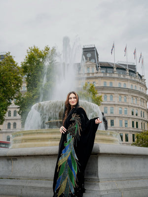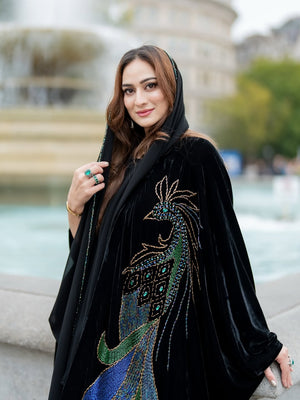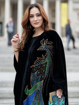 Crafted from lightweight velvet and adorned with nearly a thousand hand-embroidered colorful beads, this abaya features vibrant feather details along the hem and an elegant poncho cut for a flowing, regal silhouette. 💜💚💙
